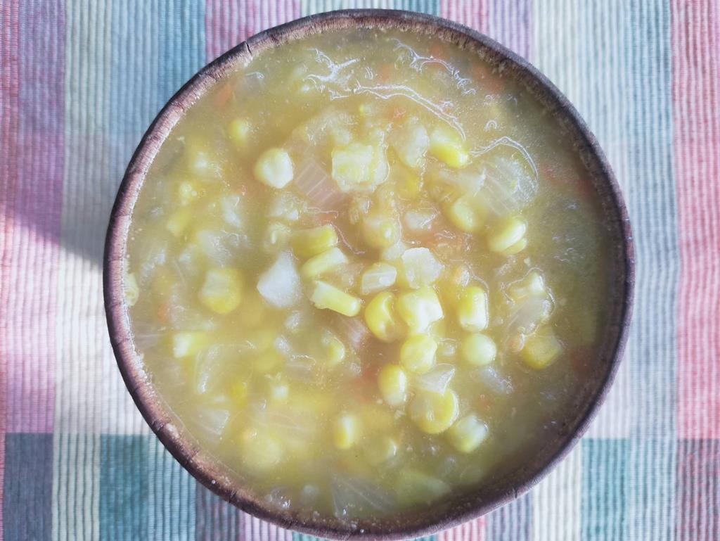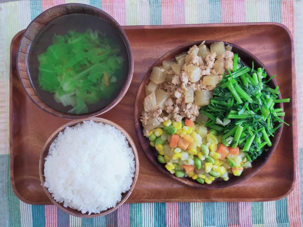 玉米燴三色、五香燒肉、鮮炒食蔬、青菜肉絲湯
