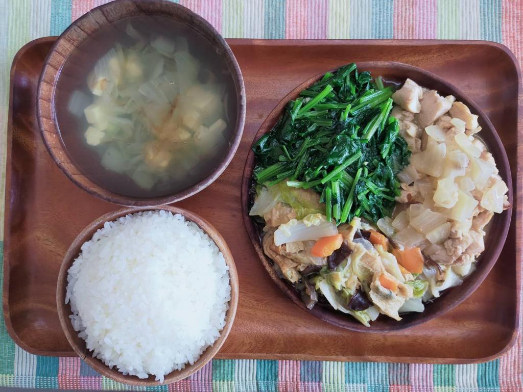 醬燒洋蔥機、白菜滷、鮮炒食蔬、味噌湯