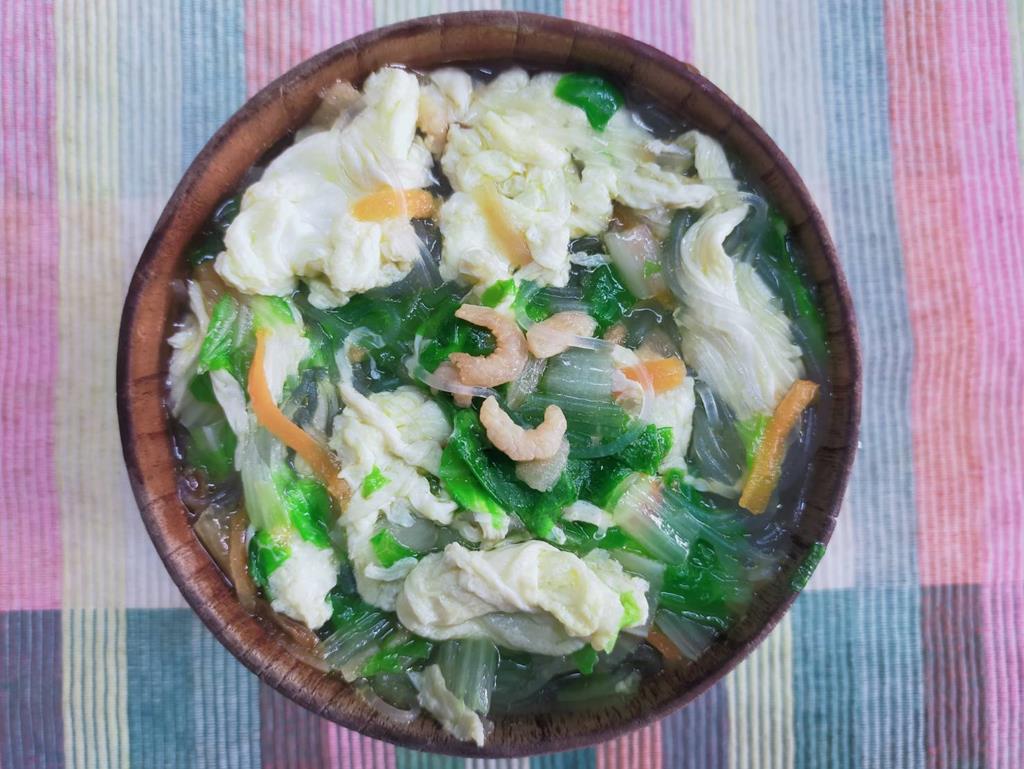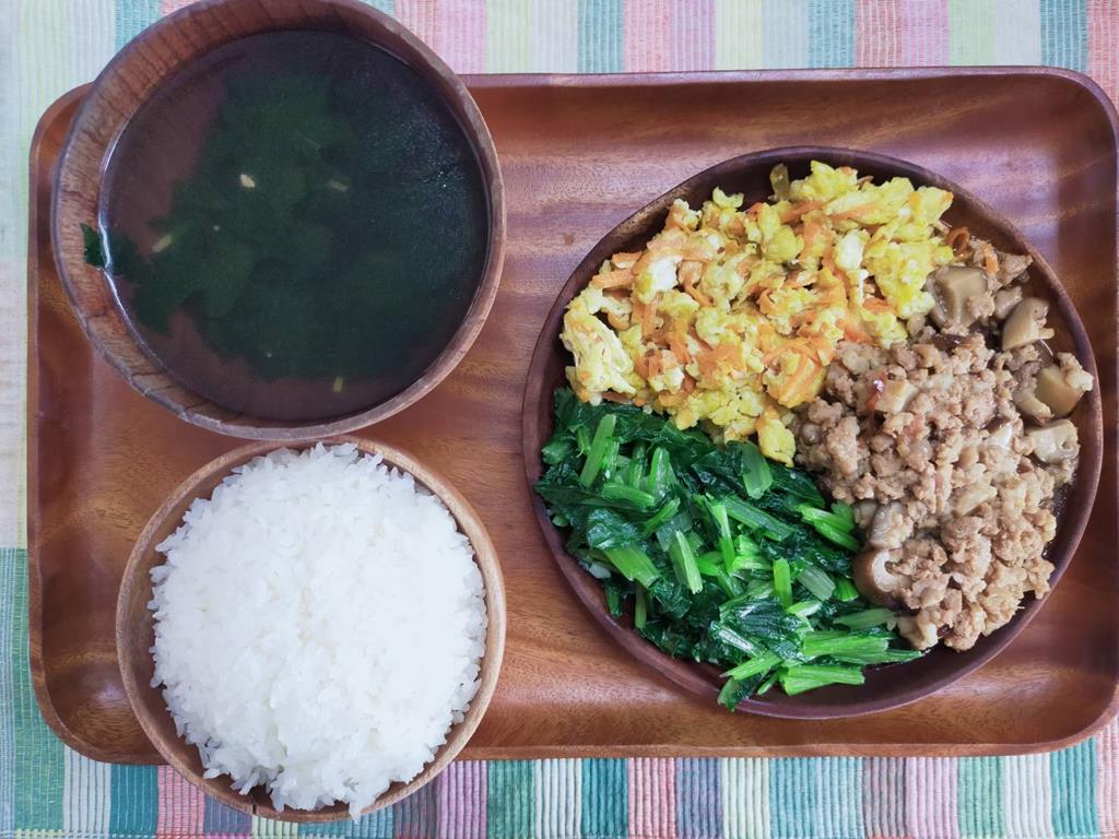 香菇肉燥、紅k炒蛋、鮮炒食蔬、海帶芽湯