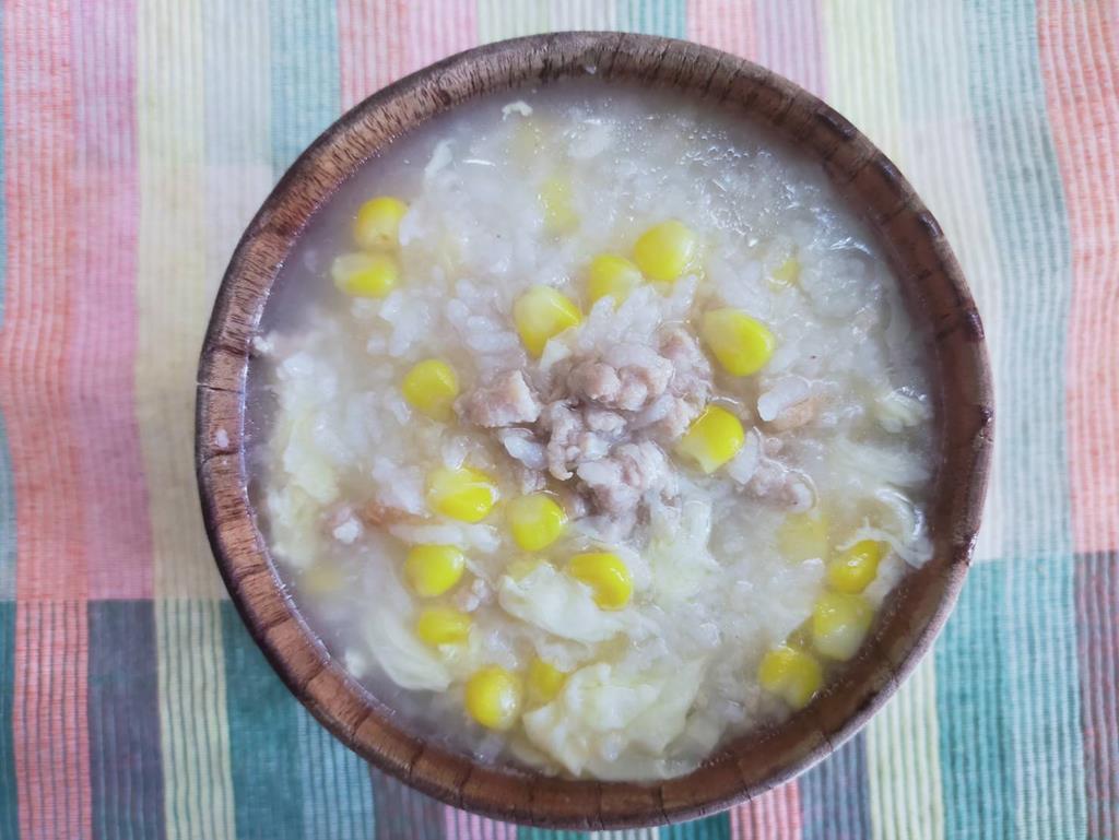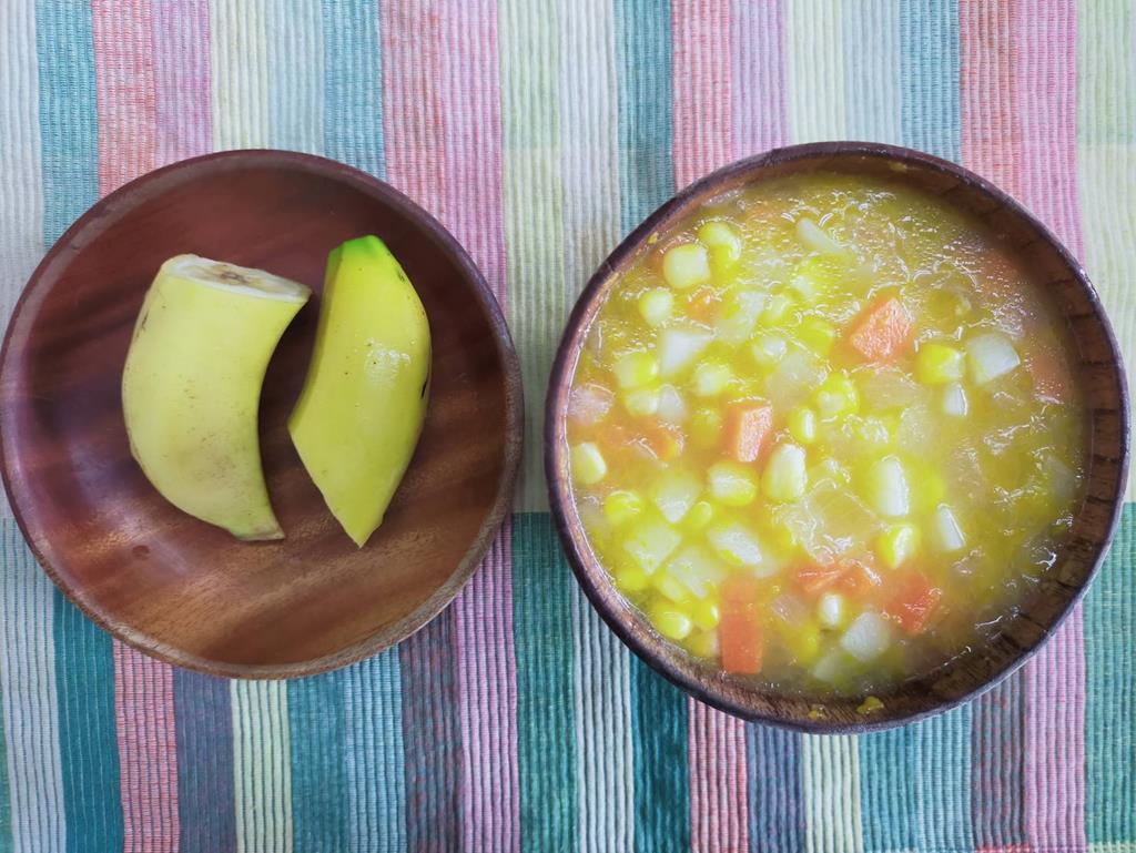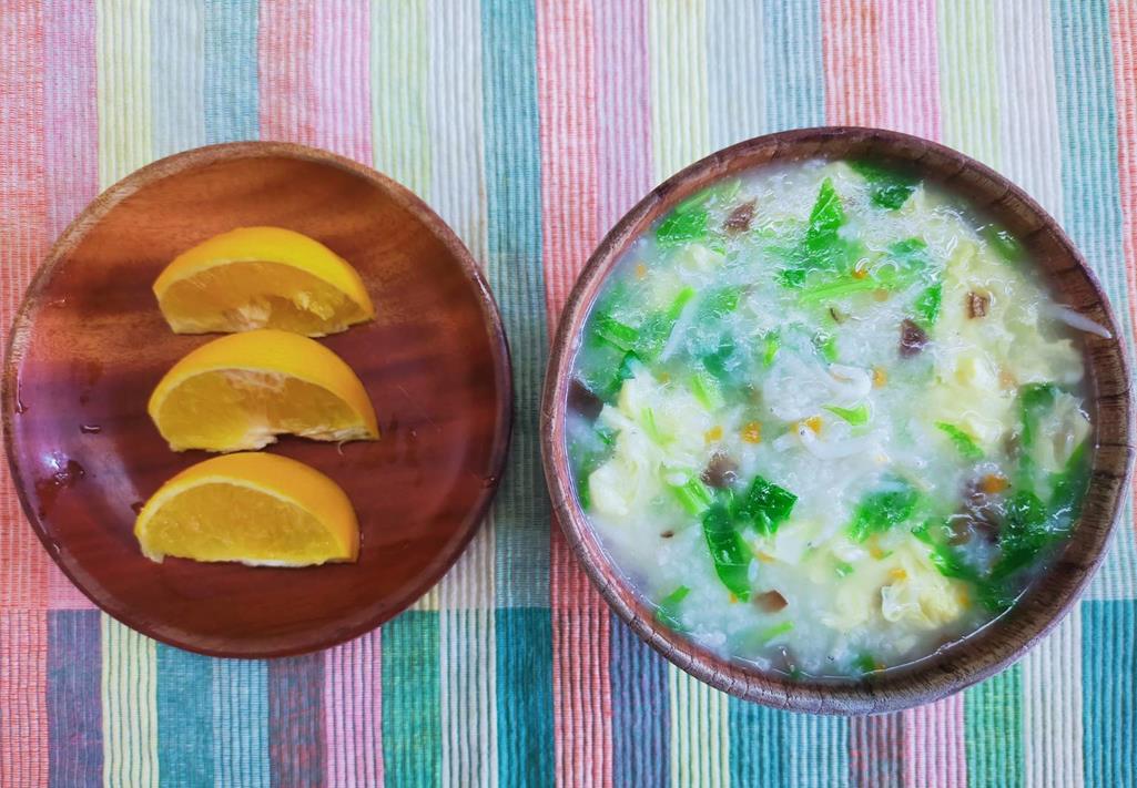 青菜小魚粥、水果