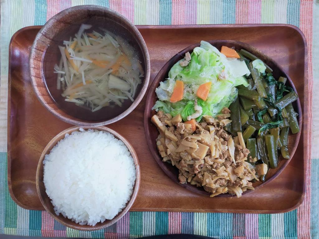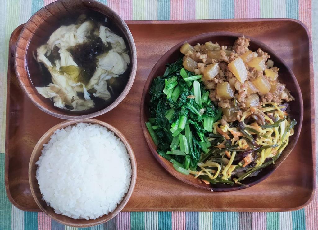 蒜炒海帶芽、筍香滷肉、鮮炒食蔬、三絲湯
