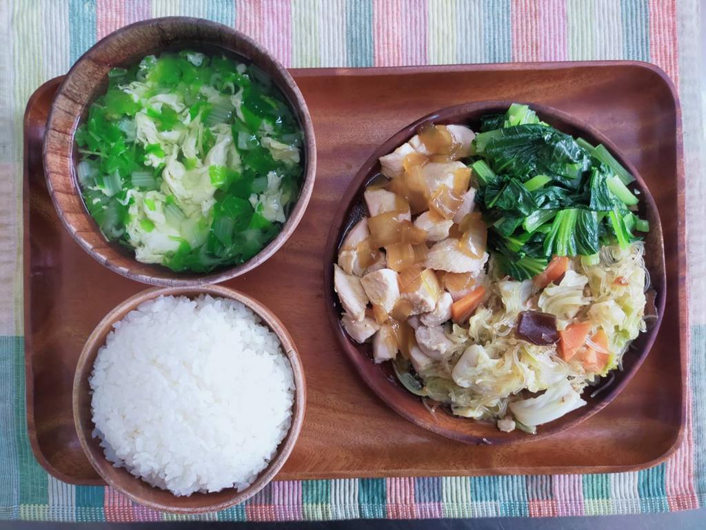 洋蔥雞丁、螞蟻上樹、鮮炒食蔬、青菜肉絲湯