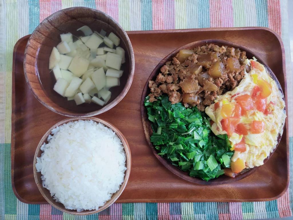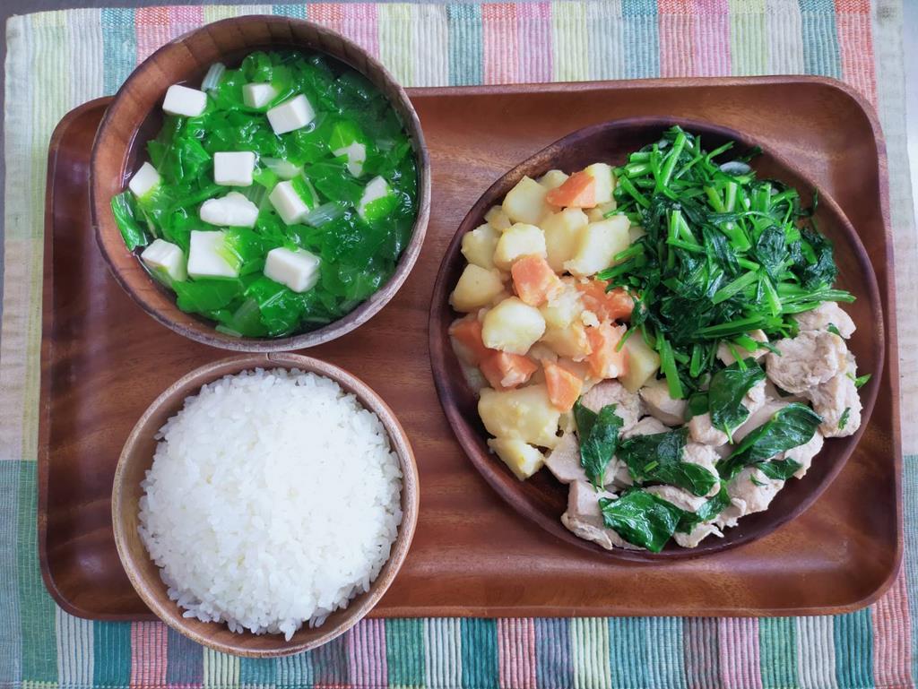 三杯雞、紅燒洋芋、鮮炒時蔬、青菜豆腐湯