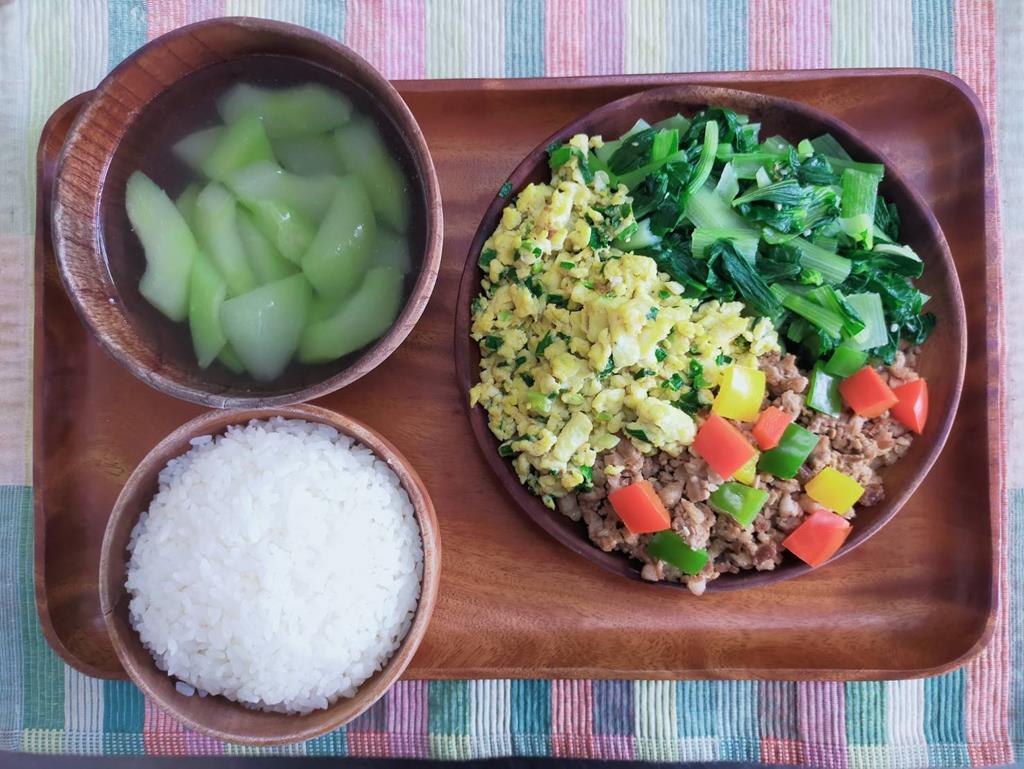 甜椒豬柳、蔥花蛋、鮮炒食蔬、黃瓜湯