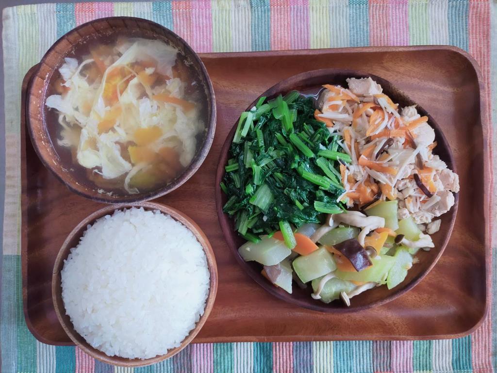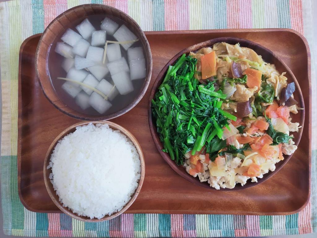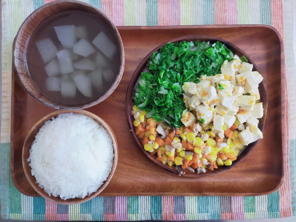 豆腐滷紅蘿蔔、玉米燴三色、鮮炒食蔬、冬瓜湯