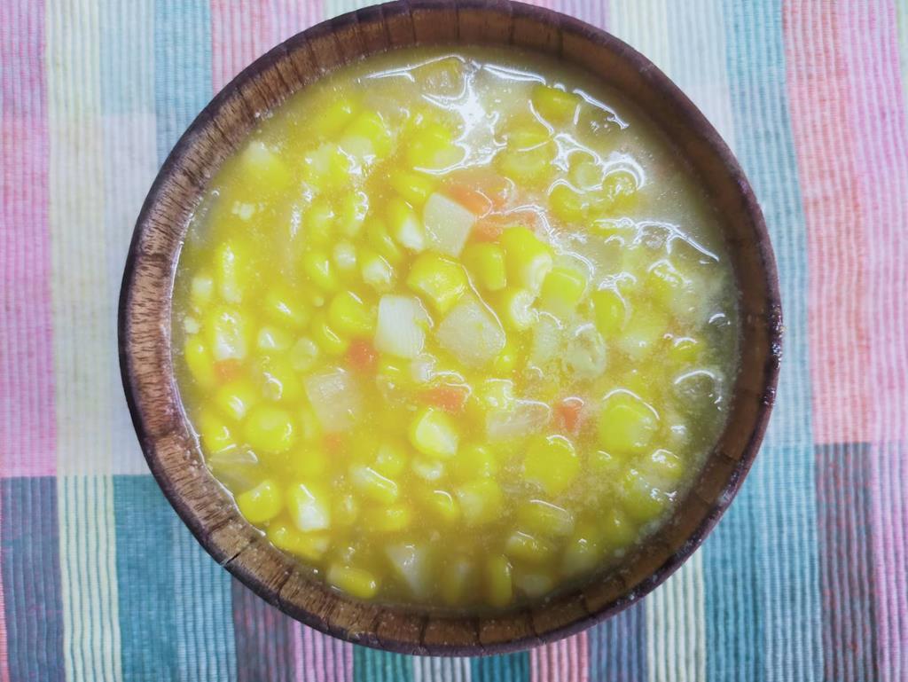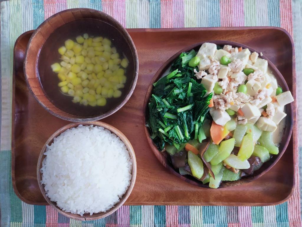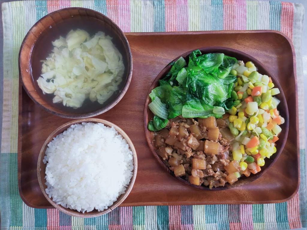 五香燒肉、玉米燴三色、鮮炒食蔬、蘿蔔湯
