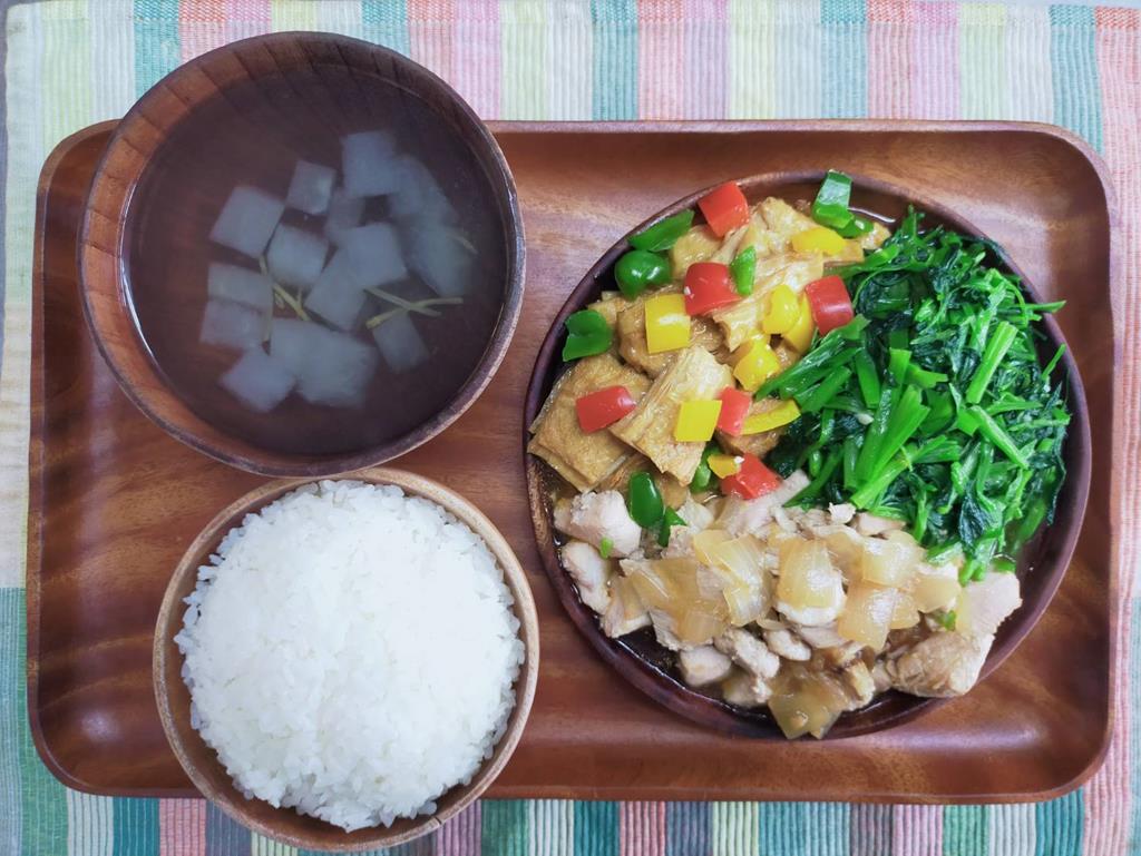 紅燒洋芋、三杯雞柳、鮮炒食蔬、冬瓜清湯