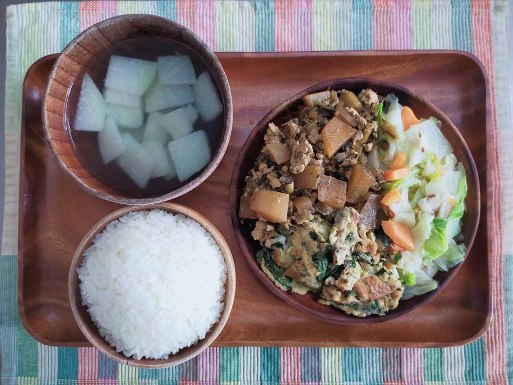 蘿蔔滷肉、玉米滑蛋、鮮炒食蔬、結頭菜湯