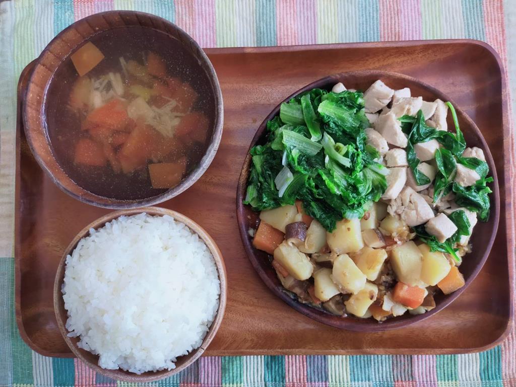 三杯雞、紅燒洋芋、鮮炒食蔬、番茄金針湯