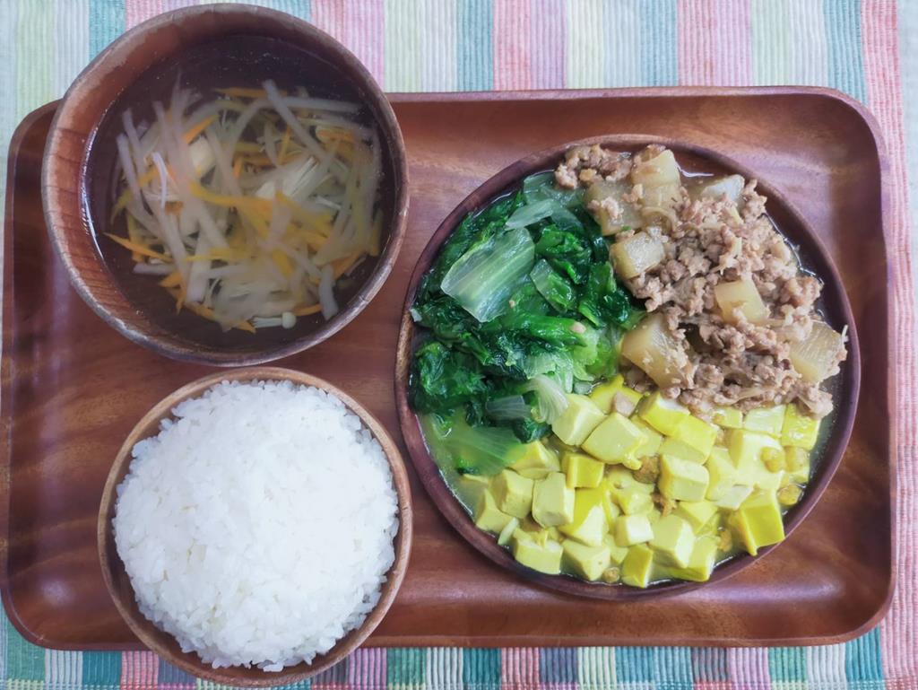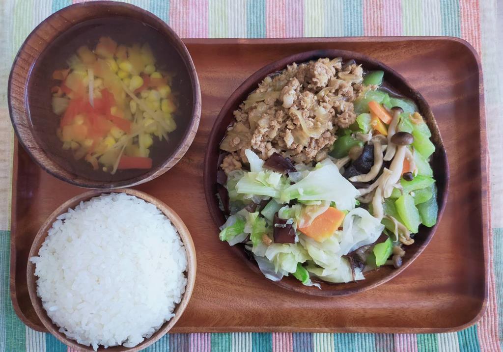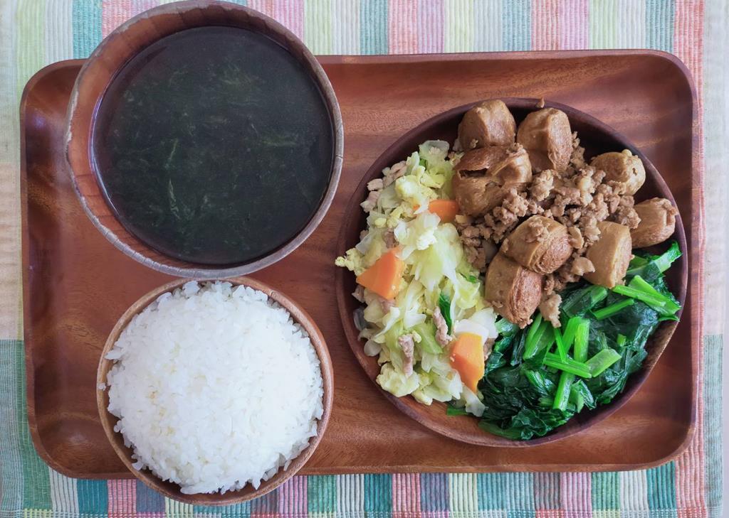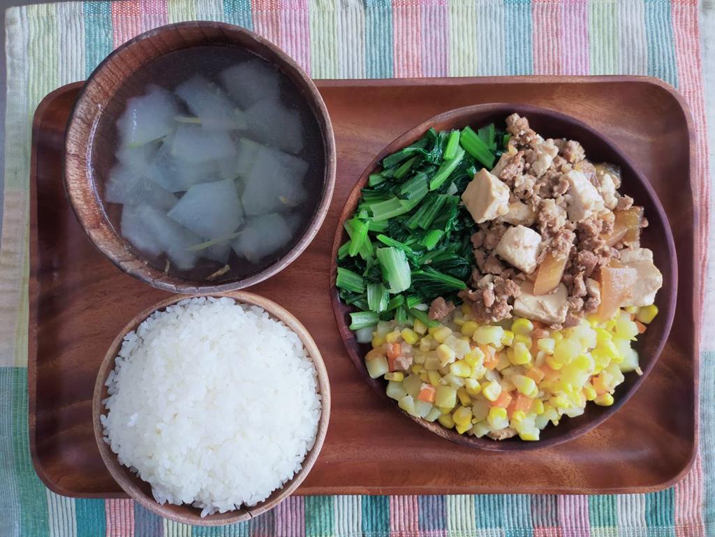豆腐滷肉.玉米燴三色.鮮炒時蔬.冬瓜清湯