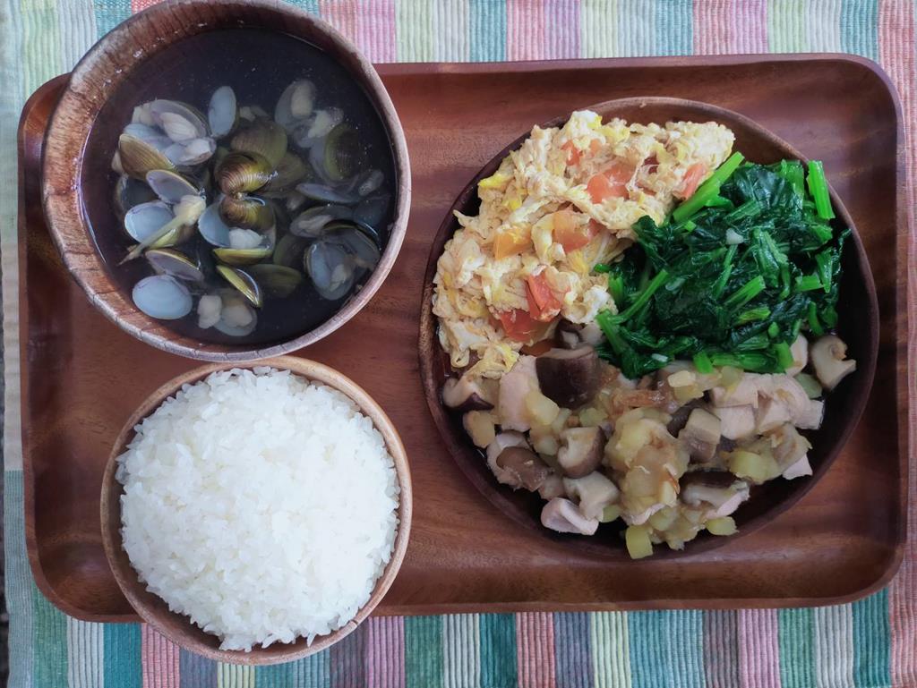 菇菇燉雞.鮮味蒸蛋.鮮炒時蔬.蜆仔湯